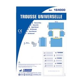 Trousse chirurgicale présentée sous double emballage, avec étiquettes de traçabilité, contenant 1 couvre table 140x160 cm + 4 champs 75x90 cm.