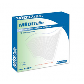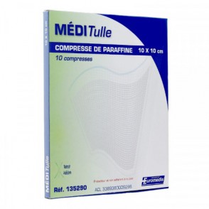 Ces compresses Méditulle sont stériles évitant ainsi tout risque de contamination par des germes. Elles se présentent sous emballage unitaire garantissant leur sécurité. Elles sont composées de larges mailles de coton imprégnées de paraffine, qui ne colle pas, garantissant un côté émollient et laissant la plaie cicatriser.