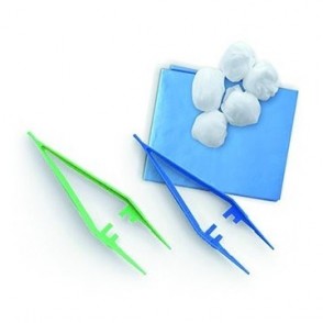 Blister 3 alvéoles + 1 champ 38 x 45 cm + 2 pinces anatomiques bouts fins bleue et verte + 5 tampons de gaze Ø 3 cm